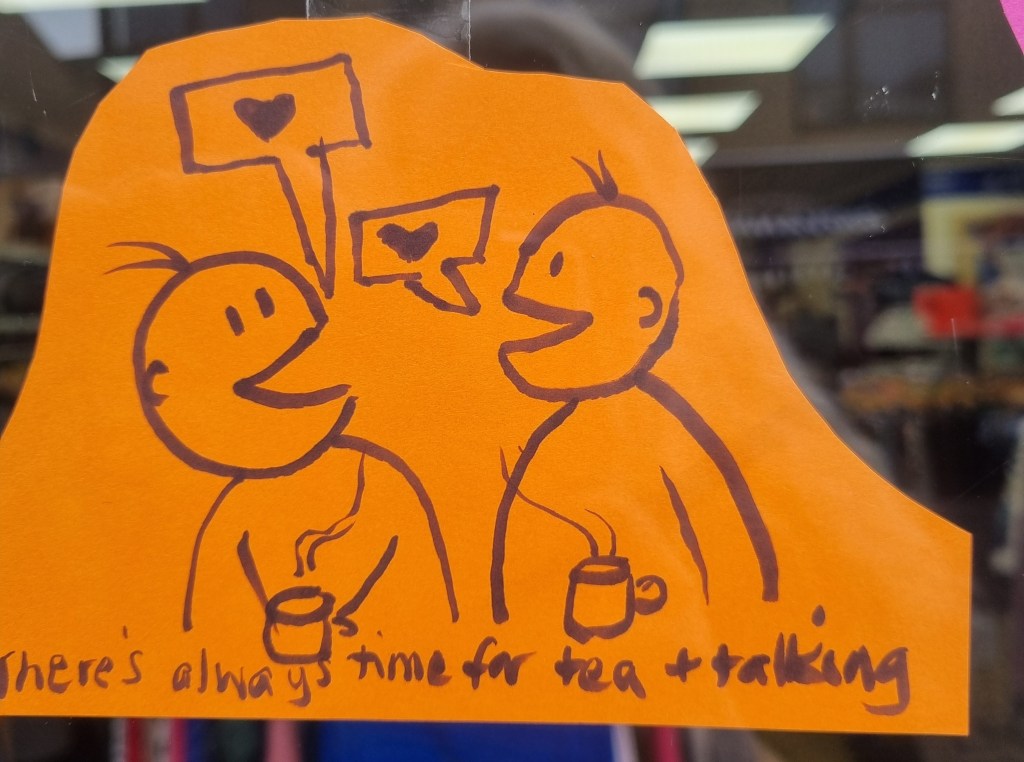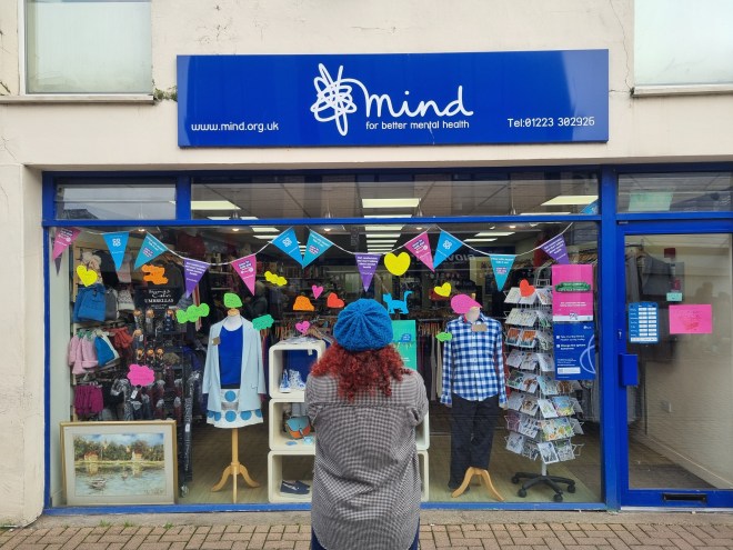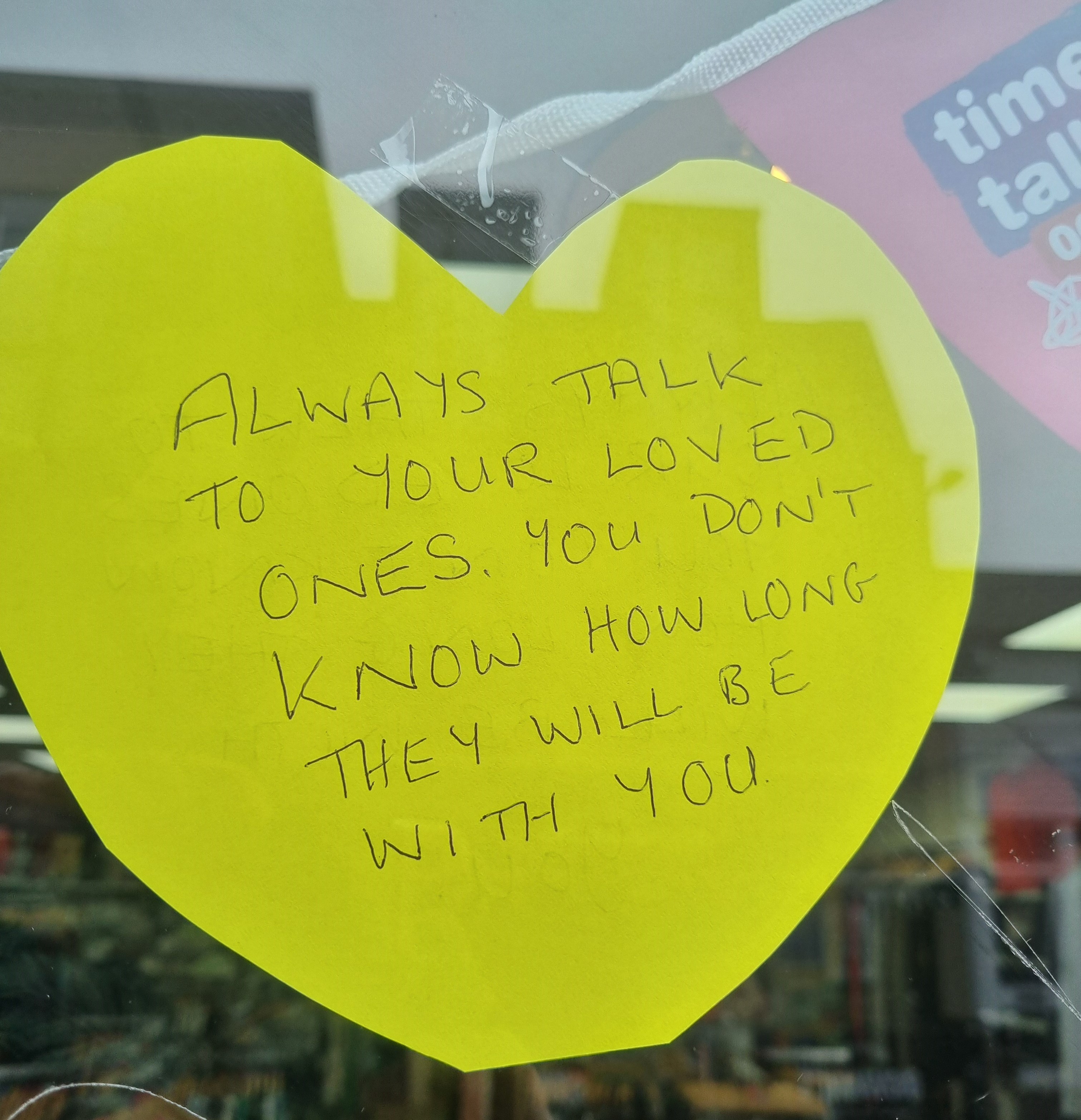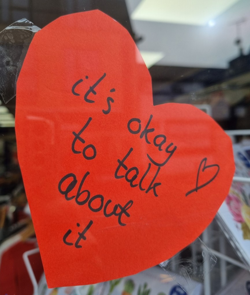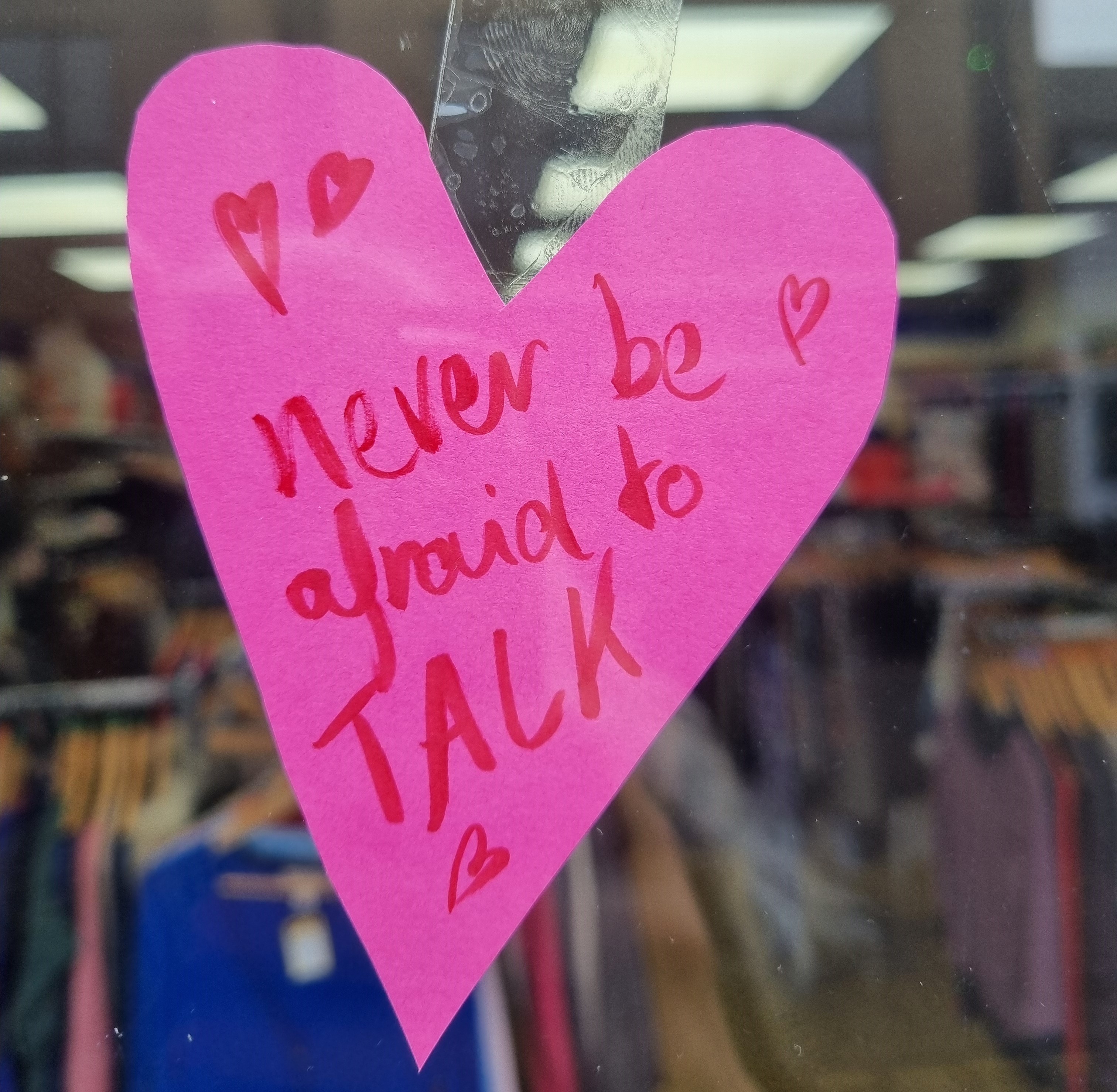 We then asked those who were willing to pick a colour, cut out a shape and write a few empowering words about mental health. The shop team, who posted their own notes too, alongside volunteers and shoppers, gave us permission to tape the sayings to the window.