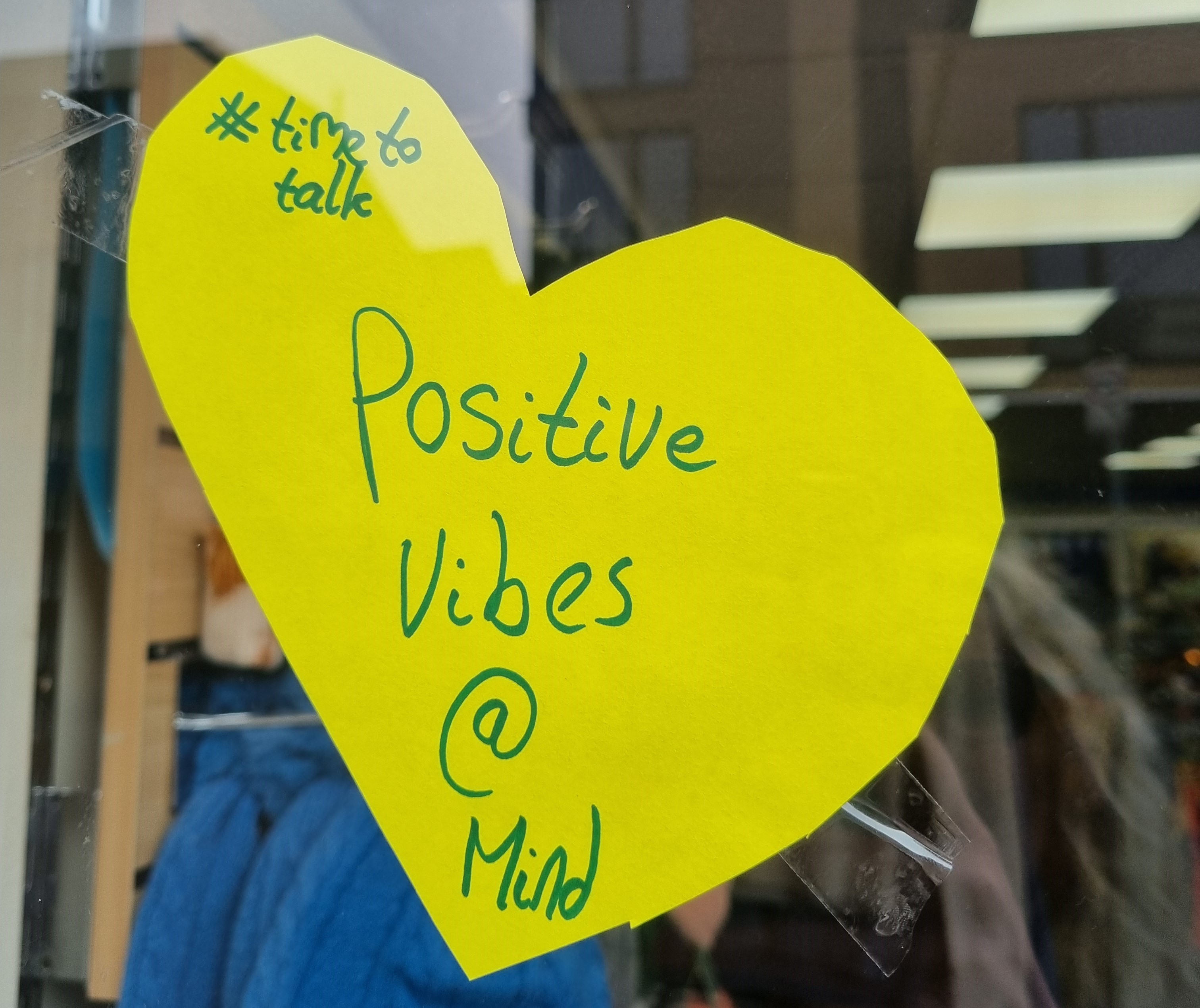 We then asked those who were willing to pick a colour, cut out a shape and write a few empowering words about mental health. The shop team, who posted their own notes too, alongside volunteers and shoppers, gave us permission to tape the sayings to the window.