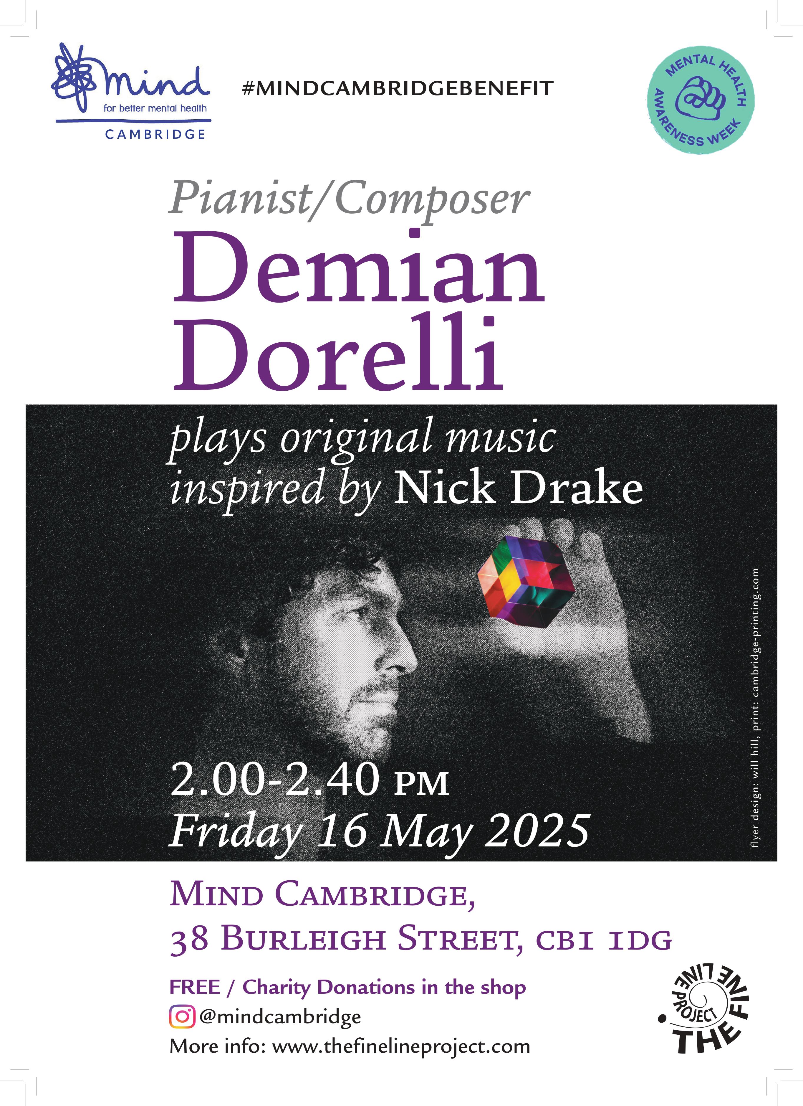 Demian Dorelli will play piano music re-imagined and inspired by Nick Drake’s magical songs , at 2.00-2.40 pm Friday 16 May 2025 at Mind Cambridge, 38 Burleigh Street, CB1 1DG. Pop that in your diary, time it for a lunch break if you’re working.